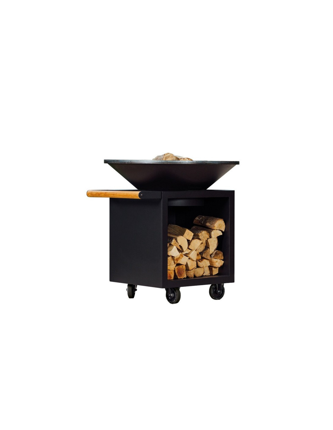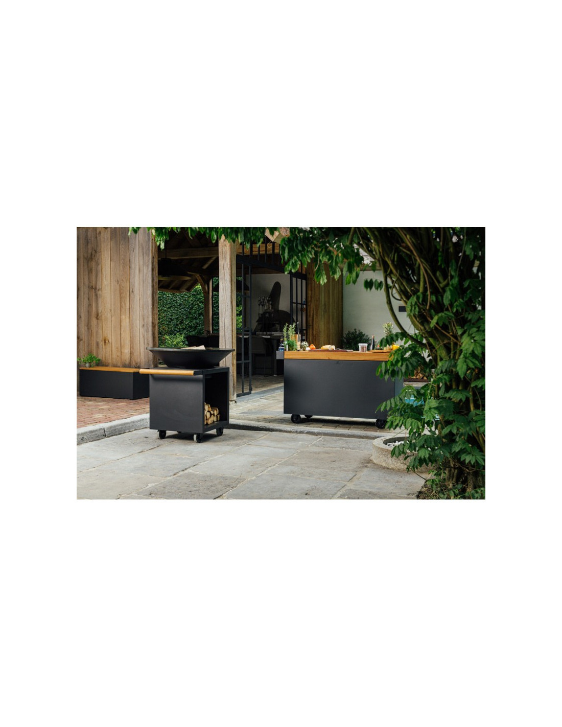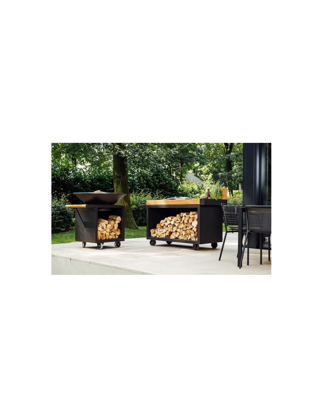 El OFYR Classic Storage 100 PRO cuenta con todas las características del OFYR Classic Storage, con la comodidad adicional de un asa de madera de teca y ruedas. Esto facilita el desplazamiento del mueble de cocina por su espacio exterior. Además, la base es más ancha y profunda para garantizar una estabilidad óptima. El espacio bajo el cono es ideal para guardar leña o accesorios.