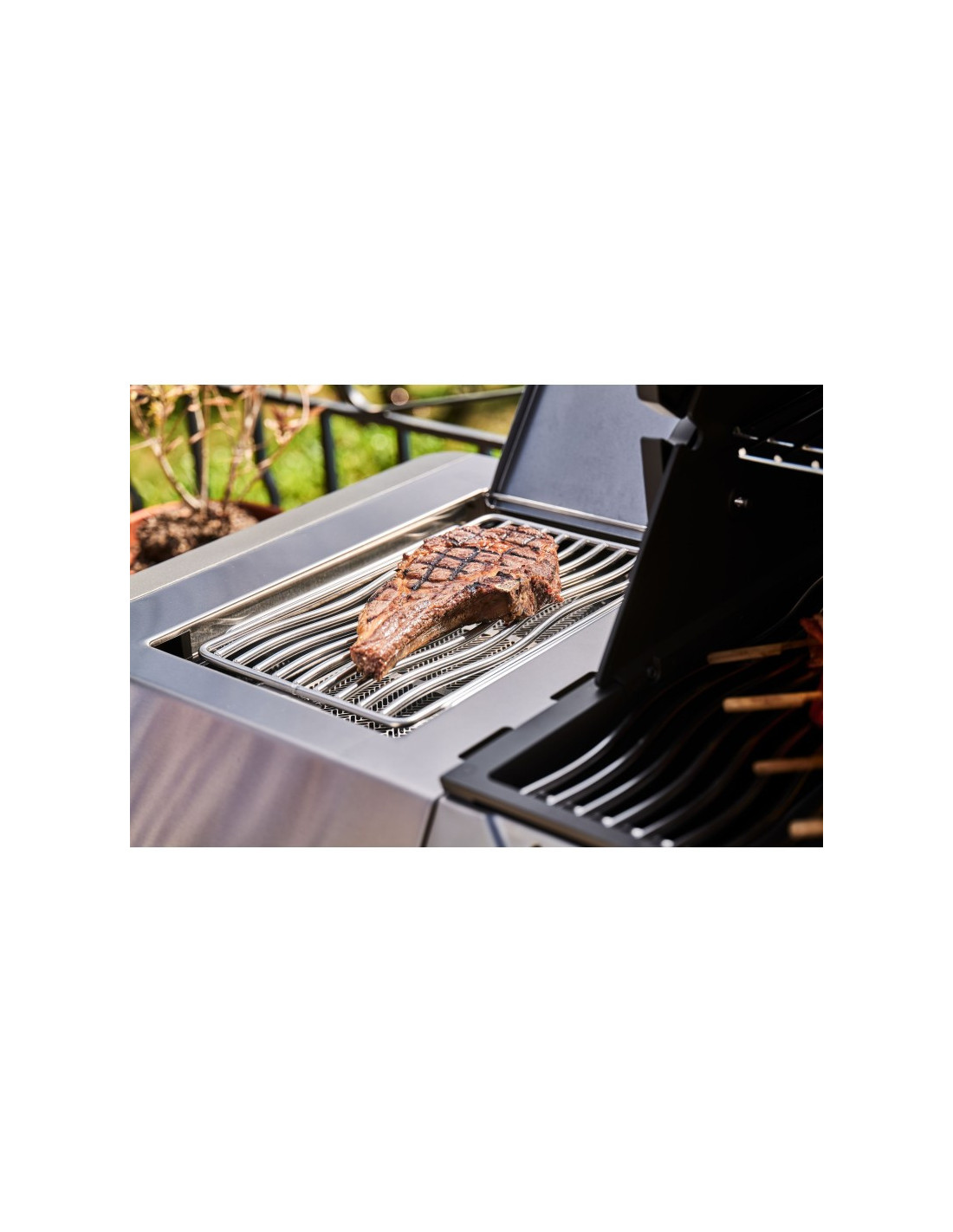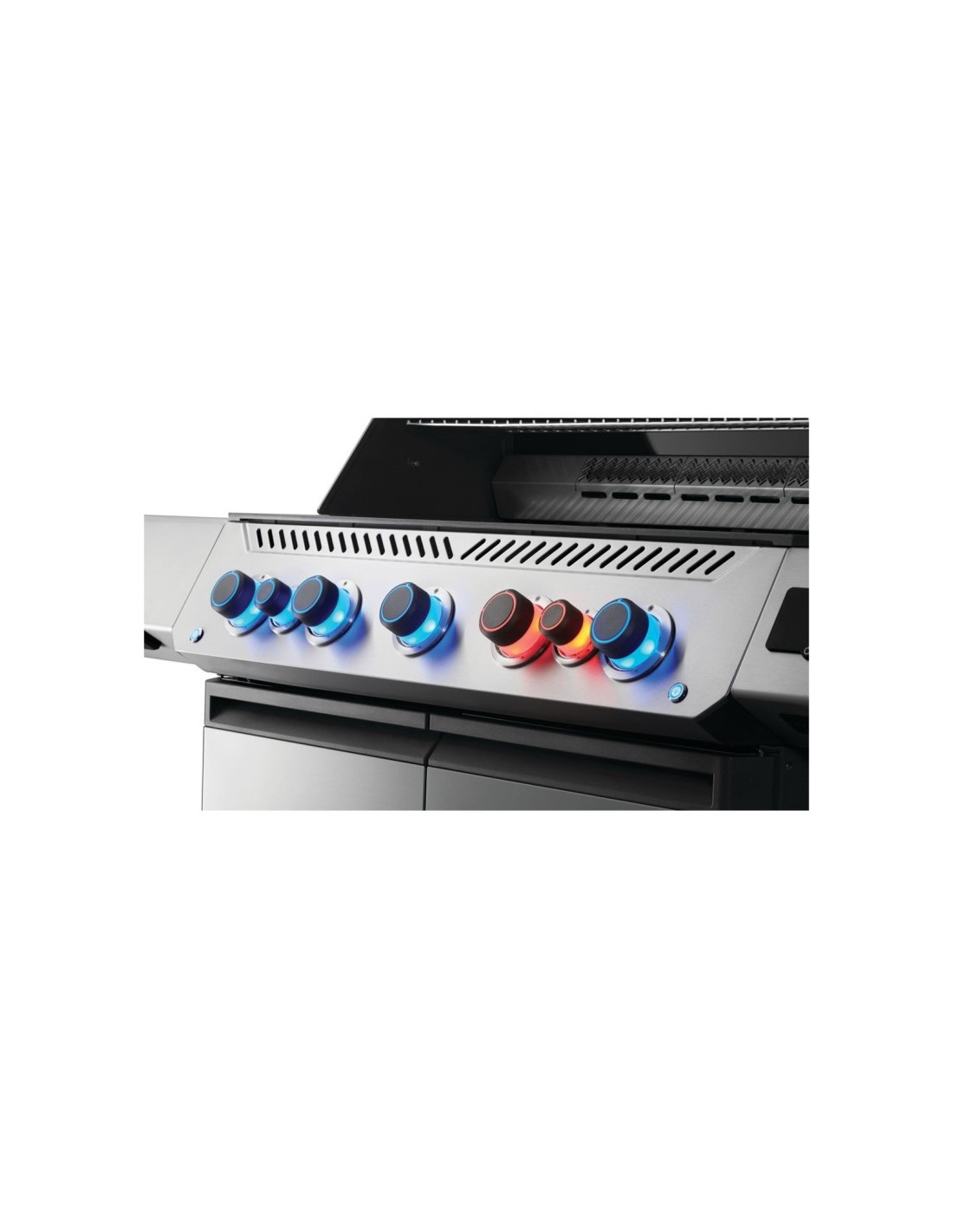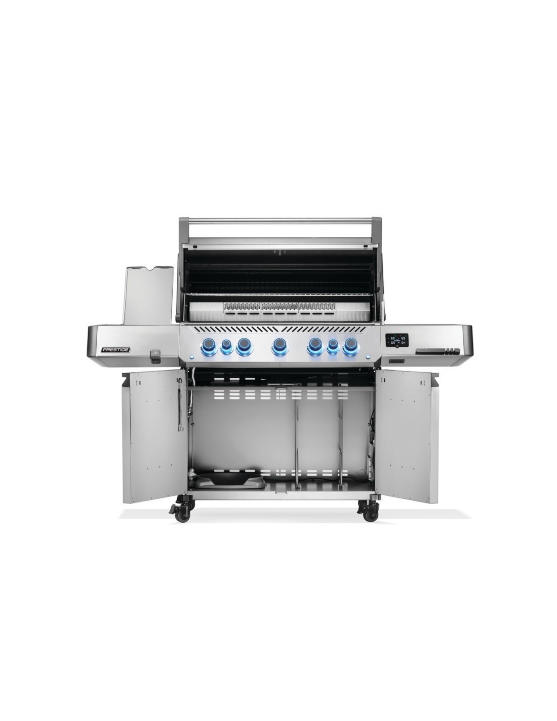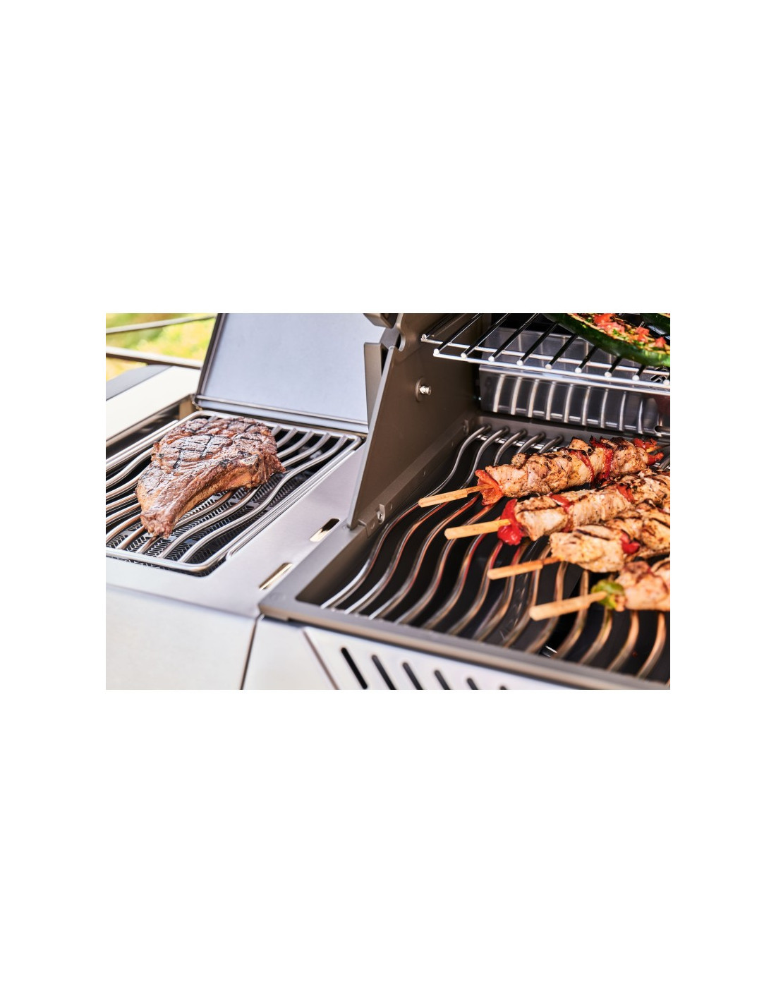 La barbacoa de gas Prestige 665 de acero inoxidable con quemadores infrarrojos traseros y laterales es una evolución de nuestra icónica barbacoa que le brinda ahora más que nunca una excelente experiencia de cocción a la parrilla. Gracias a una novedosa conectividad inalámbrica, controlará en todo momento desde su teléfono el proceso de cocción de los alimentos que esta cocinando en su barbacoa, con monitorización de temperaturas y alertas inmediatas dispondrá de la mejor tecnología para cocinar. El potente quemador trasero para el asador y el fogón lateral infrarrojo de la estación de sellado más grandes mejoran el rendimiento de la barbacoa. Las mandos de control led se iluminan para disfrutar la parrilla durante la noche, e incluyen la función SafetyGlow™ que ilumina de color rojo el botón de cada quemador cuando el gas está encendido para mayor seguridad. El estante plegable permite mantener el orden y los ganchos para utensilios ocultos brindan mayor espacio de preparación. Disfrute del diseño moderno y elegante y de los métodos de cocción únicos que ya adora con esta irresistible barbacoa de gas Prestige 665.