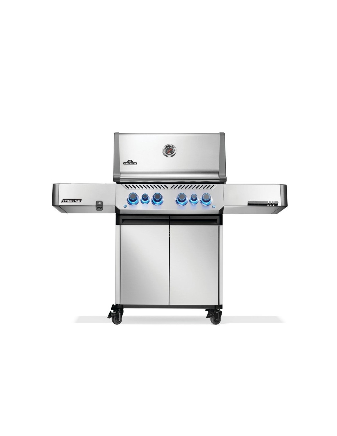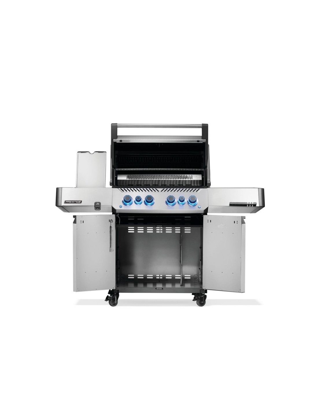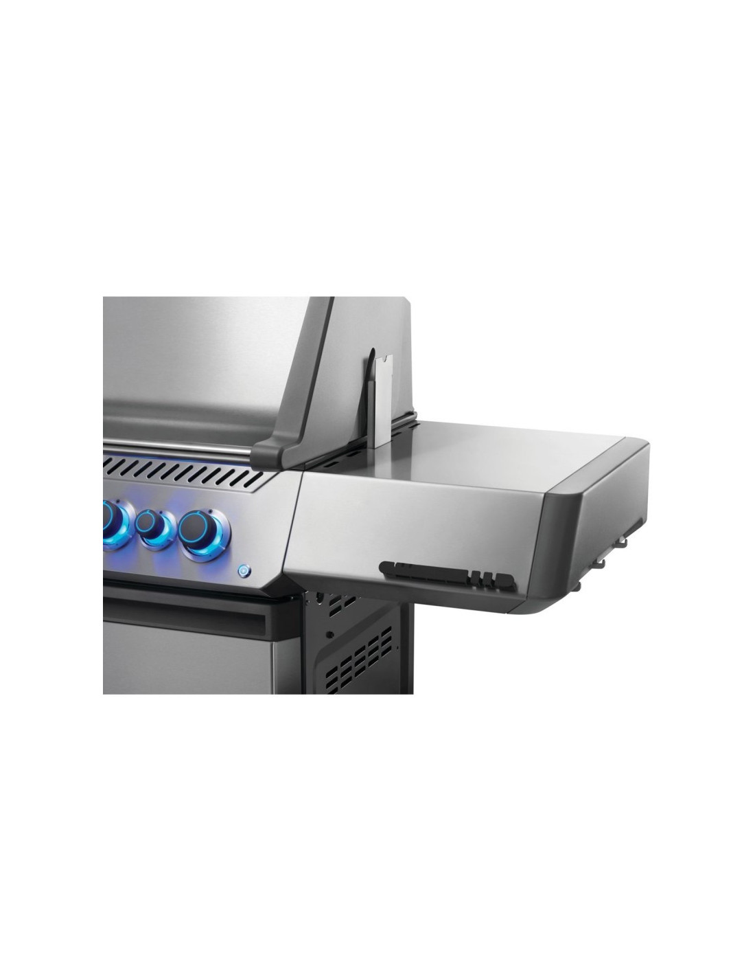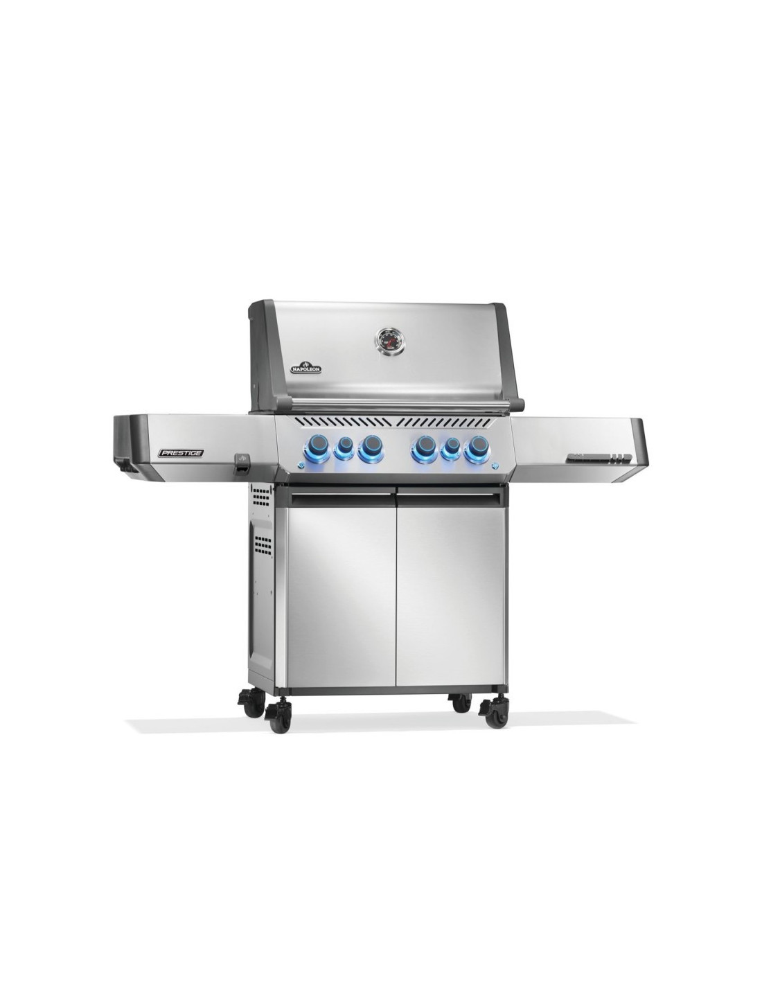 La barbacoa de gas Prestige 500 de acero inoxidable con quemadores infrarrojos traseros y laterales es una evolución de nuestra icónica barbacoa que le brinda ahora más que nunca una excelente experiencia de cocción a la parrilla. El potente quemador trasero para el asador y un fogón lateral infrarrojo de la estación de sellado más grandes mejoran el rendimiento de la barbacoa. Las mandos de control led se iluminan para disfrutar la parrilla durante la noche, e incluyen la función SafetyGlow™ que ilumina de color rojo el botón de cada quemador cuando el gas está encendido para mayor seguridad. El estante plegable permite mantener el orden y los ganchos para utensilios ocultos brindan mayor espacio de preparación. Disfrute del diseño moderno y elegante y de los métodos de cocción únicos que ya adora con esta irresistible barbacoa de gas Prestige 500.